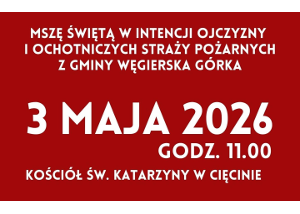 Wójt oraz Rada Gminy Węgierska Górka zapraszają na Mszę Świętą w intencji Ojczyzny i Ochotniczych Straży Pożarnych z Gminy Węgierska Górka, która odbędzie się 3 maja 2026 r. o godz. 11:00 w Kościele pw. św. Katarzyny Aleksandryjskiej w Cięcinie. Do uczestnictwa w nabożeństwie zapraszamy również poczty sztandarowe.